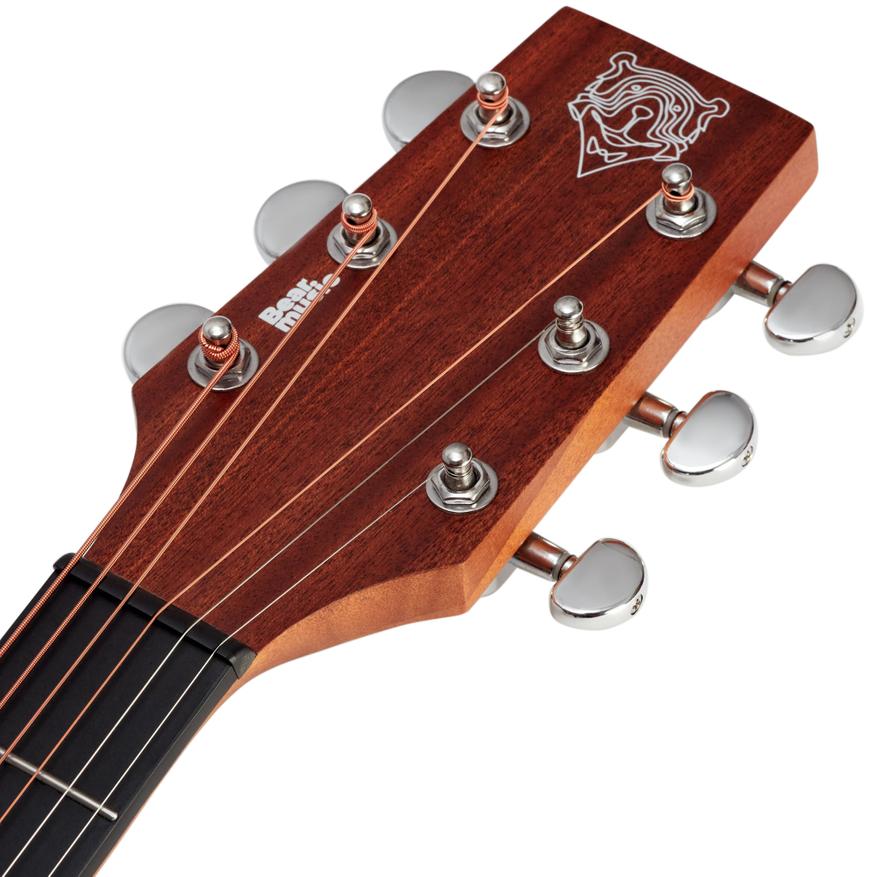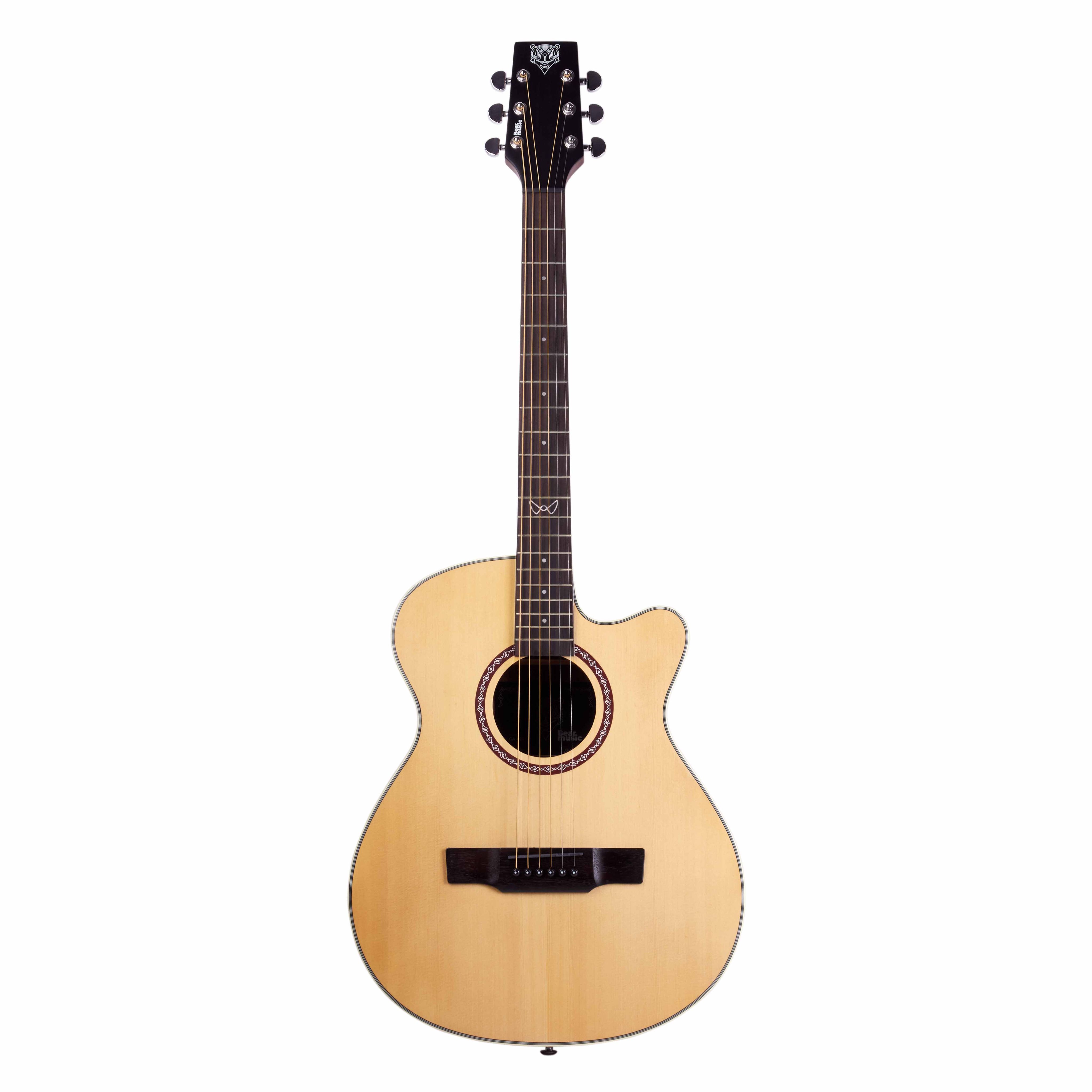Модель Bear Music GA-02F Pro создана в компактном форм-факторе Folk с вырезом, который облегчает доступ к верхним ладам и делает инструмент удобным для путешествий, домашних занятий и акустических репетиций. Здесь используется верхняя дека из массива ели «А» класса, обеспечивающая яркий тон и отзывчивость на динамику, в то время как ореховые нижняя дека и обечайки добавляют плотности и кристальной ясности звуку. Гриф из красного дерева с палисандровой накладкой делает ощущения естественными, привычными для музыкантов, а 20 сглаженных ладов и фирменная инкрустация Bear Music помогают уверенно ориентироваться на грифе. GA-02F Pro позиционируется как тёплый и мобильный инструмент на каждый день.