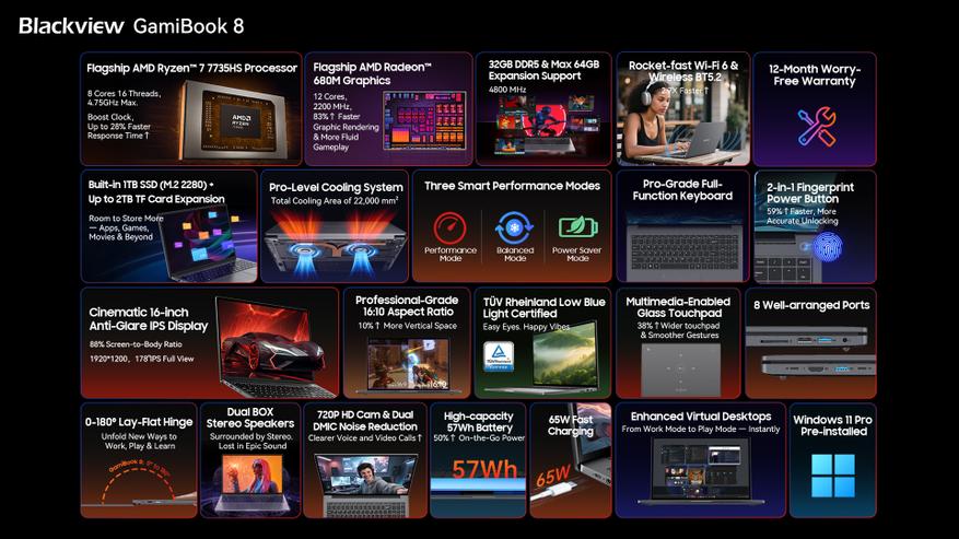 Blackview анонсировала новый ноутбук GamiBook 8, который сочетает высокую производительность с портативностью. Устройство весом всего 1,8 кг оснащено процессором AMD Ryzen 7 7735HS и графикой Radeon 680M, обеспечивая мощность настольного уровня. С 32 ГБ оперативной памяти DDR5, накопителем на 1 ТБ и 16-дюймовым дисплеем с поддержкой трёх мониторов, этот ноутбук ориентирован на профессионалов, геймеров и творческих пользователей.