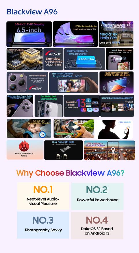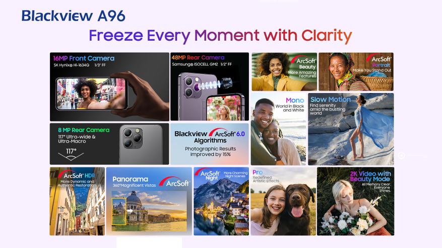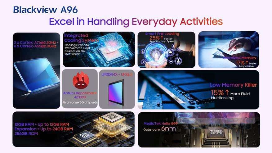 Blackview A96 оснащен 6-нм процессором MediaTek Helio G99, 8 или 12 ГБ оперативной памяти и 256 ГБ флеш-памяти. A96 оснащен фронтальной камерой 16 Мп, основной камерой Samsung разрешением 48 Мп, а также сверхширокоугольной и акрокамерой 8 Мп с углом обзора 117° для съемки крупным планом.
