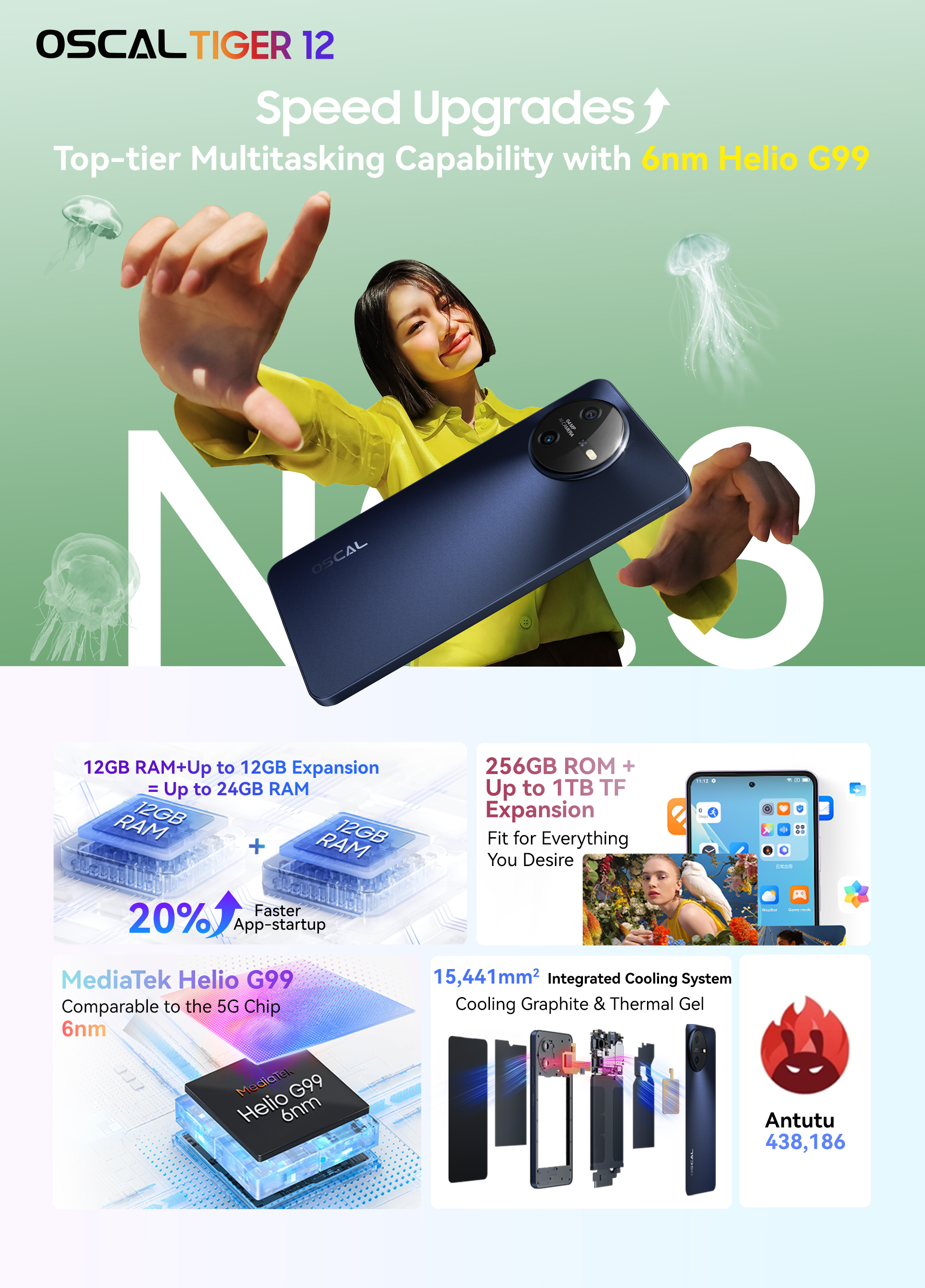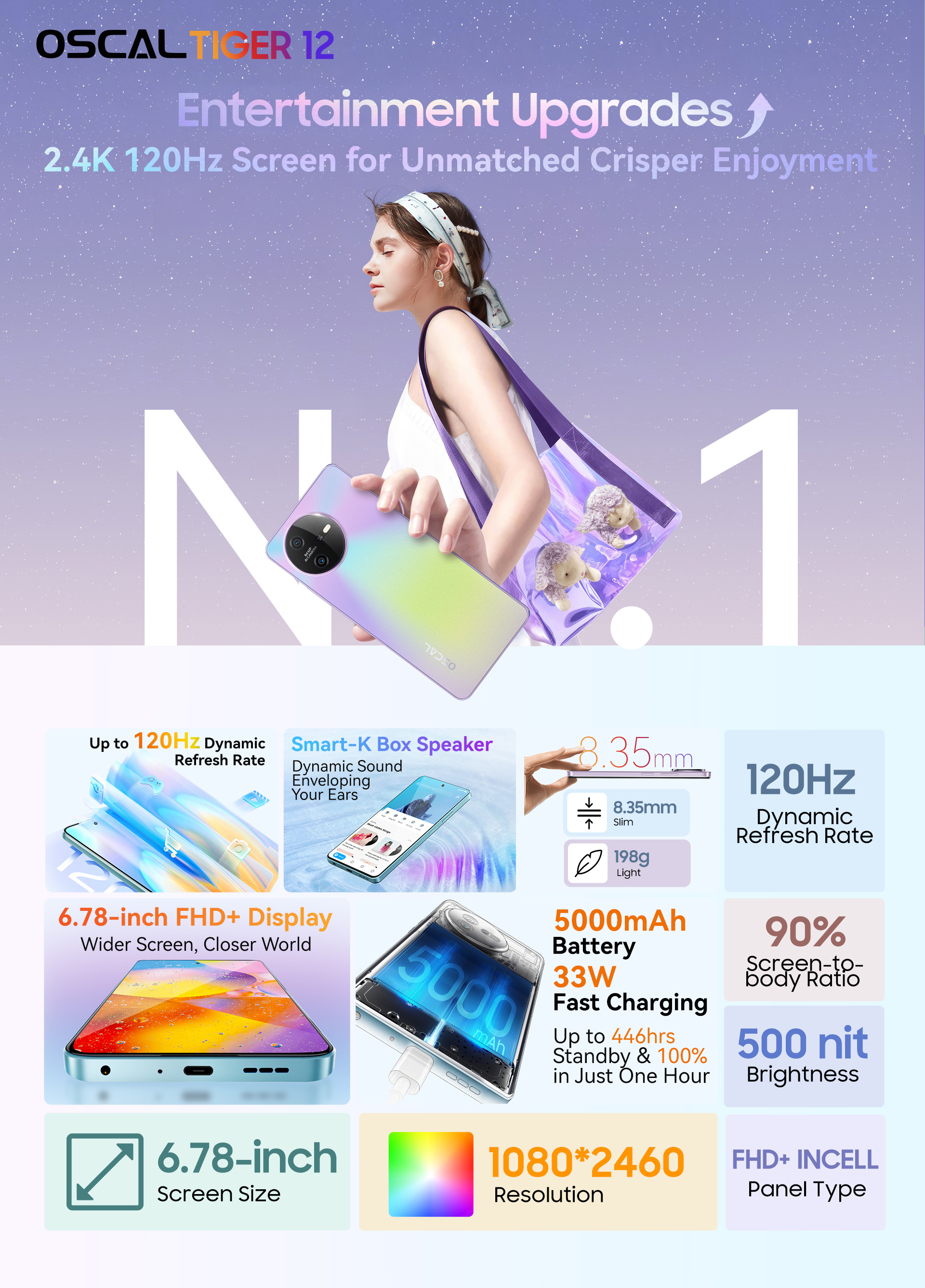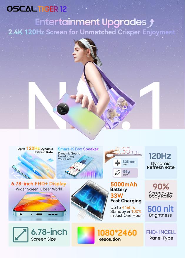 Oscal Tiger 12, ориентированный на молодежь, предлагается в различных цветах, такие как лазурно-синий, фиолетовый и серый. Он получил ультратонкий корпус толщиной 8,35 мм и легкий вес 198 г. Пользователи смогут насладиться качественным звуком благодаря динамику Smart-K Box.