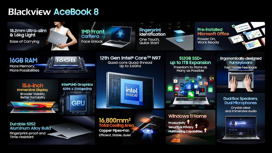 Несмотря на мобильную компактную конструкцию, Blackview AceBook 8 оснащен производительной «начинкой» — процессором Intel N97, 16 ГБ оперативной и 512 ГБ на твердотельном накопителе с возможностью расширения до 1 ТБ. Работать ноутбук будет под управлением актуальной Windows 11 Home с предустановленным пакетом Microsoft Office.