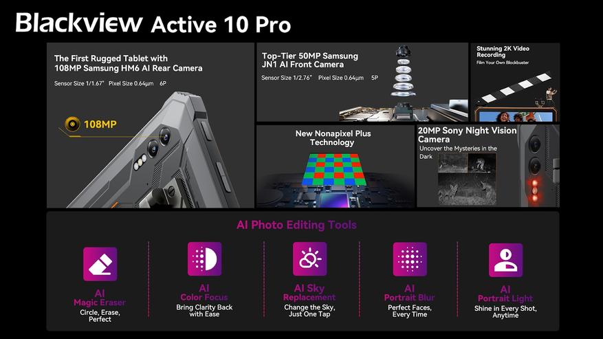 В декабре 2024 года компания Blackview анонсировала выпуск защищенного планшета Active 10 Pro, который объединил в себе функциональность мобильного устройства и туристического оборудования. Главной особенностью новинки стал встроенный кемпинговый фонарь мощностью 400 люмен с несколькими режимами работы, включая SOS-сигнализацию и быструю вспышку.