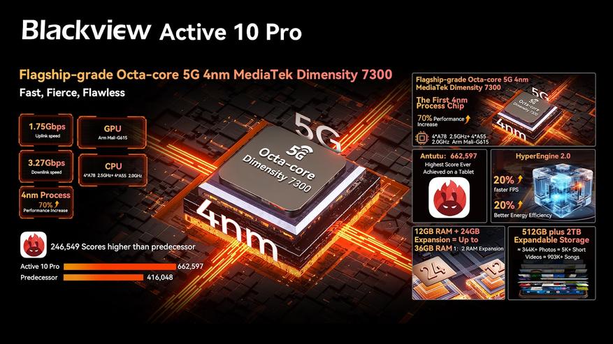 Производительность планшета обеспечивает 4-нанометровый процессор MediaTek Dimensity 7300 с поддержкой 5G, дополненный впечатляющими 36 ГБ оперативной и 512 ГБ встроенной флеш-памяти.