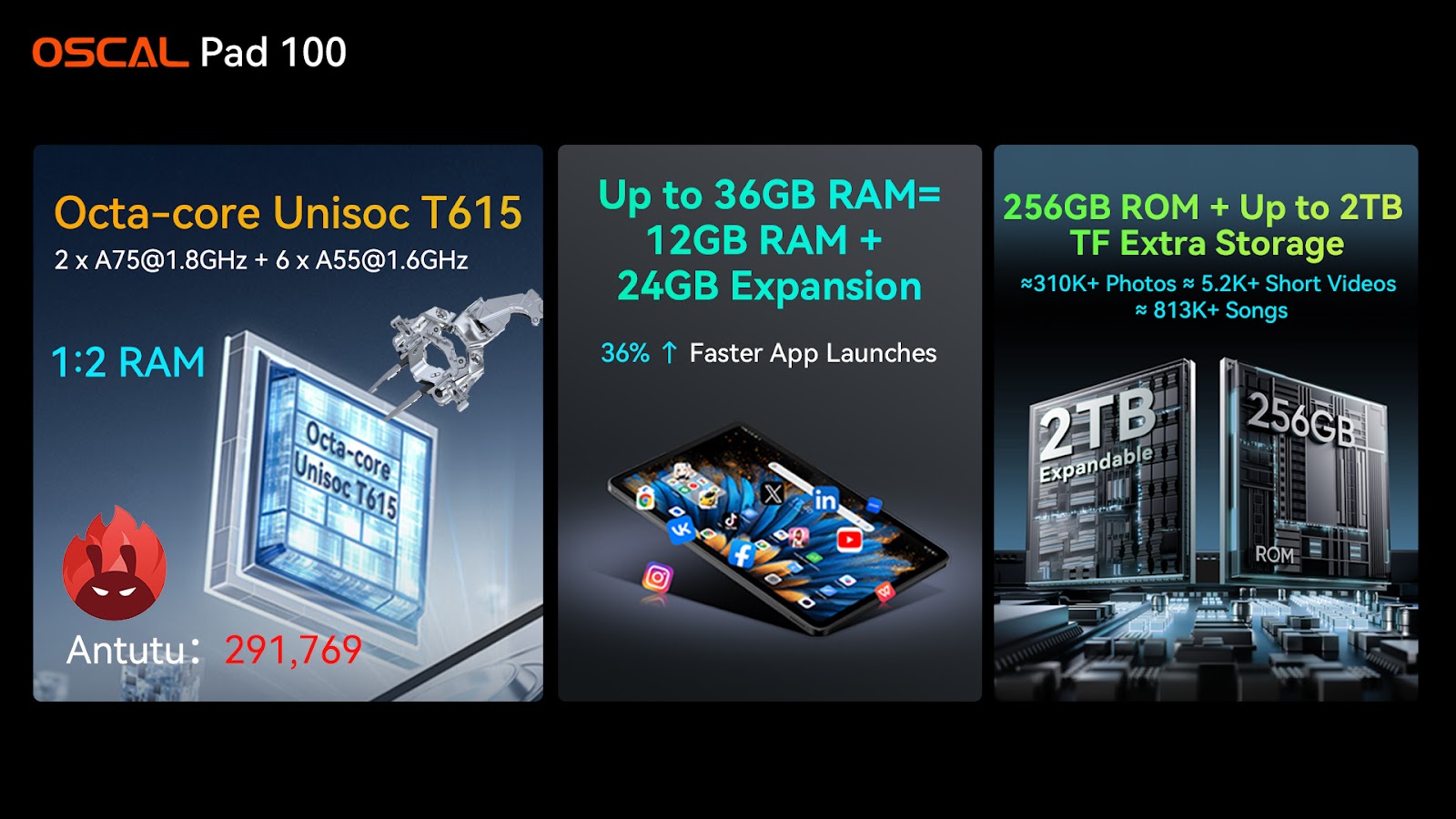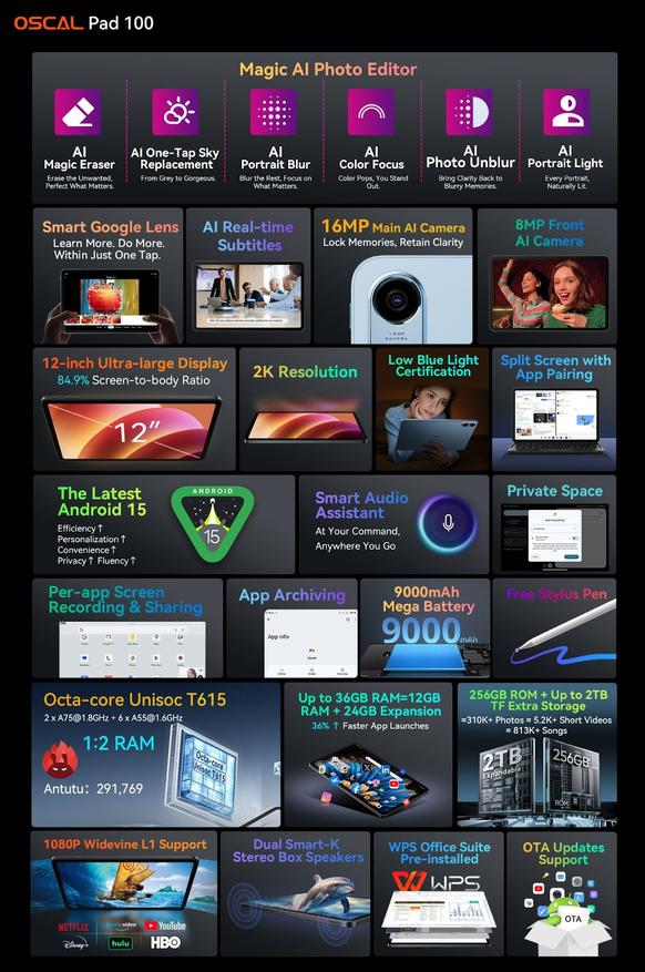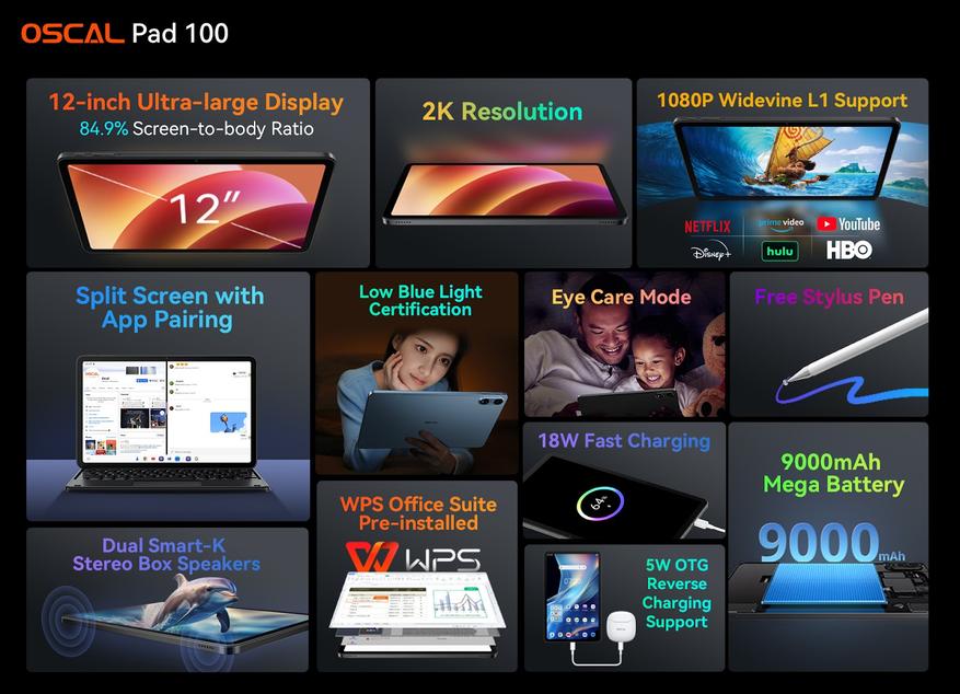 Oscal Pad 100 оснащен мощным чипом Unisoc Tiger T615 и 12-дюймовым экраном с разрешением 2K. Экран планшета поддерживает 16,7 миллиона цветов и обеспечивает на 30% больше рабочей площади по сравнению с традиционными 10-дюймовыми дисплеями. Кроме того, устройство сертифицировано для работы в условиях низкого синего света, что делает его удобным для длительного использования, а специальные режимы защиты глаз помогают избежать напряжения глаз при долгих сессиях.