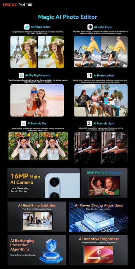 Одной из главных особенностей Pad 100 является его поддержка искусственного интеллекта. Среди функций стоит отметить интеллектуальные инструменты для редактирования фотографий, такие как Magic Eraser для удаления фона, Sky Replacement для замены неба и Portrait Blur для акцента на главном объекте. Также устройство оснащено алгоритмом энергосбережения, который помогает продлить время работы, а система защиты от перегрева и перезарядки гарантирует безопасную эксплуатацию.