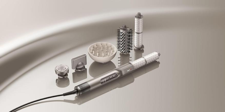 Фен Dazzle оснащен системой автоматической завивки Auto Wrap Curling System, которая упрощает процесс создания локонов. Устройство самостоятельно подбирает температуру в зависимости от типа волос и распознает насадки для оптимального режима. В комплекте пять насадок: для мягкой сушки с защитой от перегрева, стилизации с направленным потоком, диффузор для сохранения кудрей, круглая щетка для объема и двойная 38-мм насадка для завивки. Быстрый режим сушит короткие волосы за 40 секунд, а до плеч — за 3-4 минуты. Система NTC мониторит температуру 1000 раз в секунду, а дисплей показывает текущие параметры.
