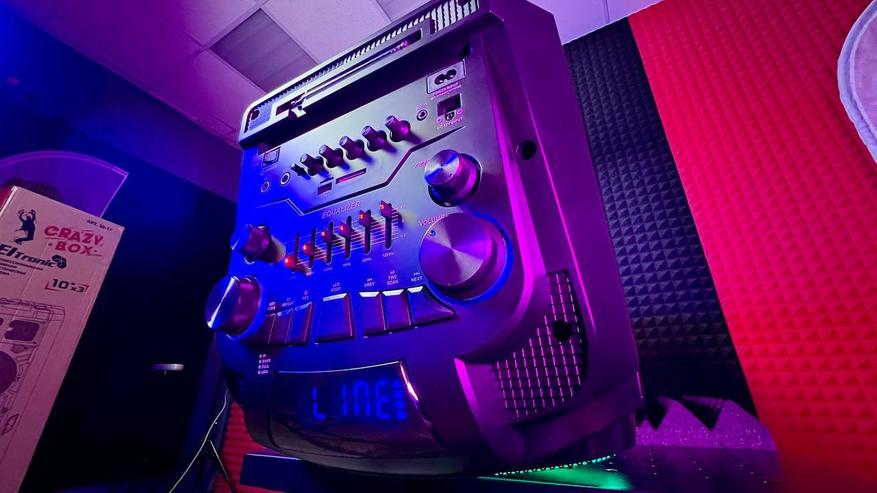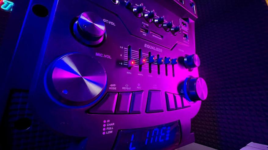 Большая центральная клавиша LED MODE служит переключателем режимов динамической подсветки громкоговорителей, а опция REC позволяет записать звучание микрофона или гитары на внешний носитель (USB или карту памяти). Функция REPEAT зацикливает звучащую композицию на повтор, а переключатель MODE запускает меню режимов звукового потока (выбор возможен между проводным линейным входом, Bluetooth, USB или картридер плеерами, а также потоковым FM-радио).