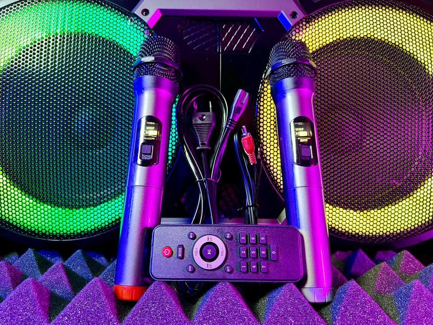 Акустика, подобная ELTRONIC 30-17 CRAZY BOX, обычно у бренда идет в хорошей комплектации, и этот случай не исключение: в наборе есть пульт для удаленного управления колонкой, кабель для подключения к гаджету AUX, соответствующий провод для питания колонки, подробная инструкция и два микрофона без проводов, которые помогут провести отличное мероприятие. Очевидно, что микрофоны не заточены для академического вокала, но для обычного, застольного пения будут оптимальны.