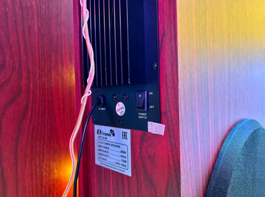 Так как акустическая система исключительно домашняя, то и питается она исключительно от сети, поэтому при расстановке колонок в комнате, стоит учитывать расположение розеток. И не желательно их ставить вплотную к стене, смежной с соседями, потому что это для вас мощность в 2000 Вт в пиковом эквиваленте — это счастье, а они могут быть в шоке от громкого и мощного звука.