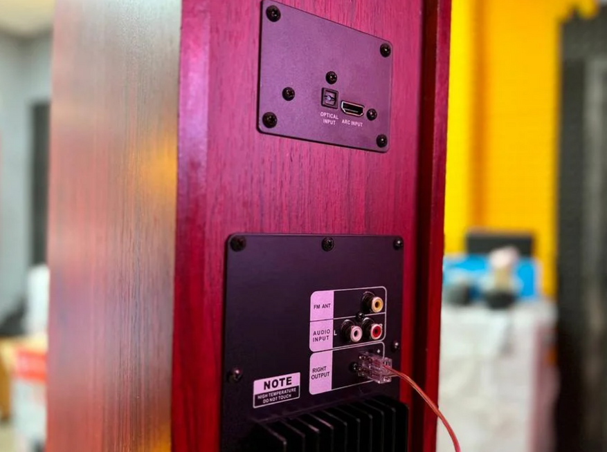 На задней стенке активной колонки установлены разъемы для подключения ТВ (оптический и HDMI), AUX-аудиовход на RCA-паре, одиночный RCA для установки проводной антенны и вывод-подача сигнала с активной левой колонки на пассивную правую.