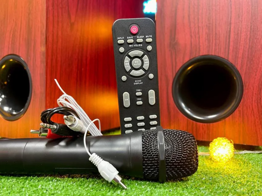 Внутри коробки с акустической системой ELTRONIC 20-80 можно найти не только две большие колонки, но и пуль дистанционного управления с любимого кресла, а также беспроводной микрофон, если вы захотите отдохнуть после просмотра фильма и начать петь караоке, тем более, что подобная функция уже встроена в акустику.