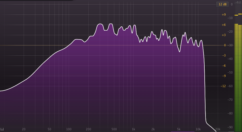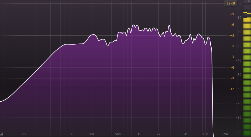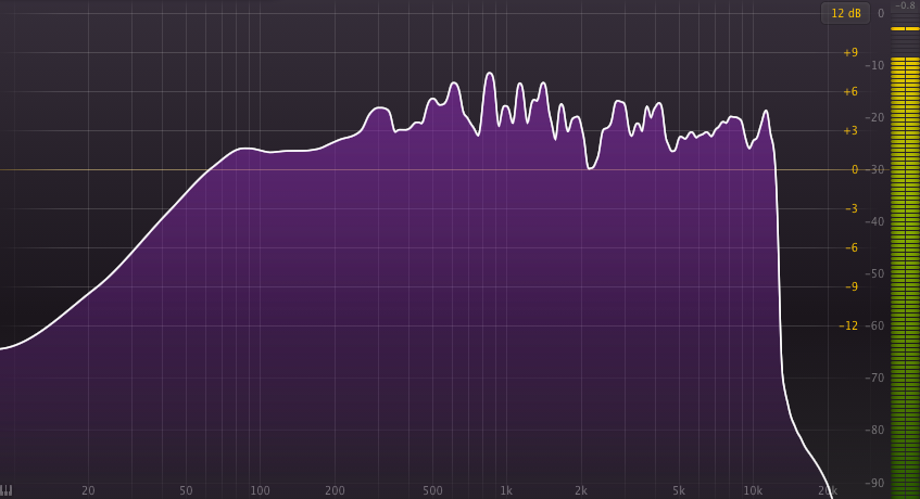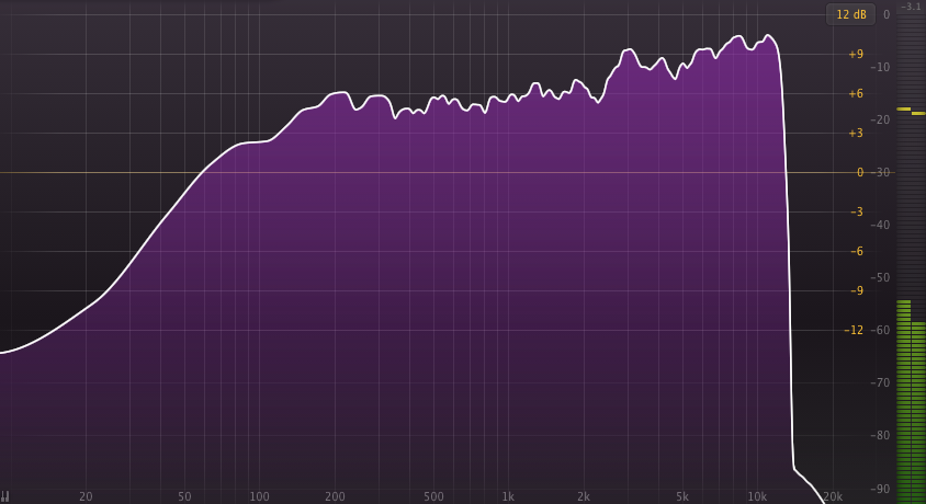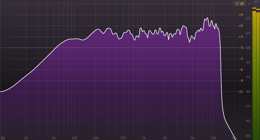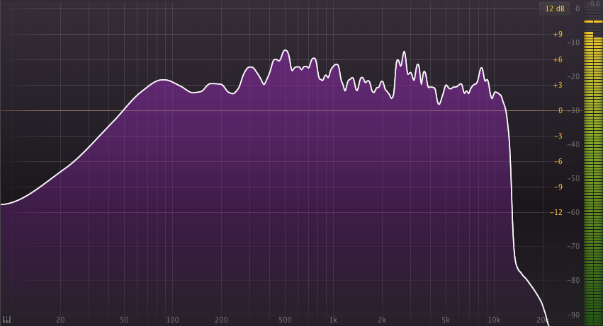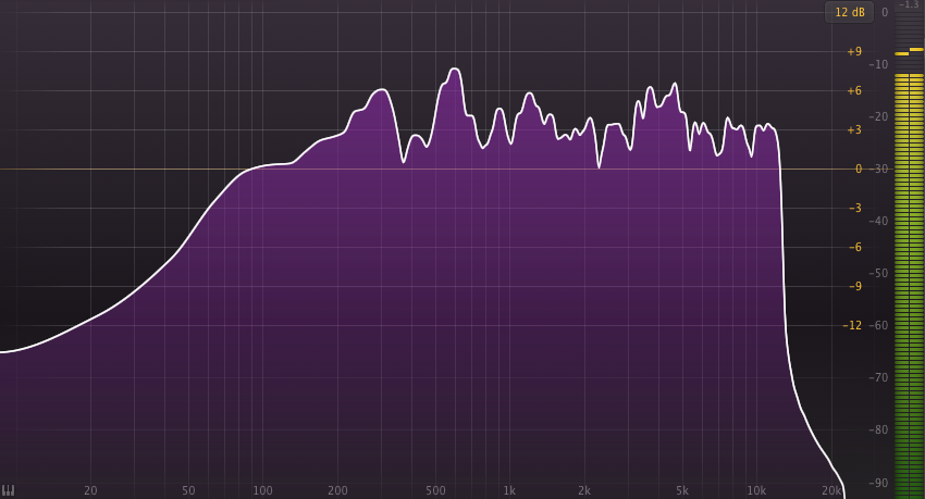 Активная частотная зона звучания системы: 50 Гц — 14 кГц с относительно плотной и ровной волной, спадов ниже 0 дБ почти не наблюдается в пределах периметра от 20 Гц до 20 кГц.