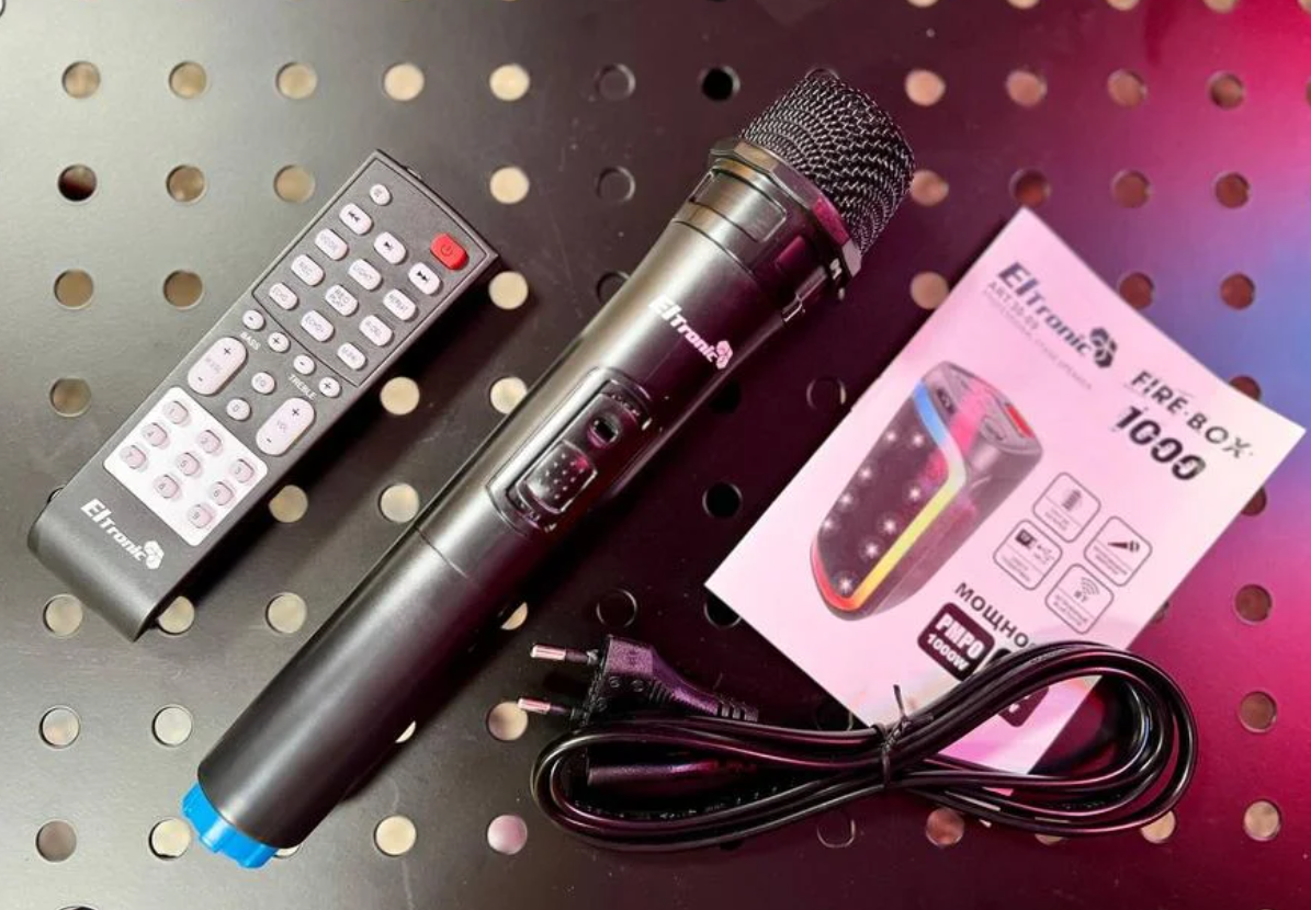 У акустической системы ELTRONIC 30-09 есть и дополнительный функционал для вечеринок, в частности, эффект стробоскопа раскачает публику, а проводной микрофон, уже идущий в комплекте, поможет спеть караоке или провести интересные конкурсы. Если поискать в коробке, то еще можно найти пульт, чтобы управлять дистанционно, и инструкцию, чтобы понять, как управлять колонкой.