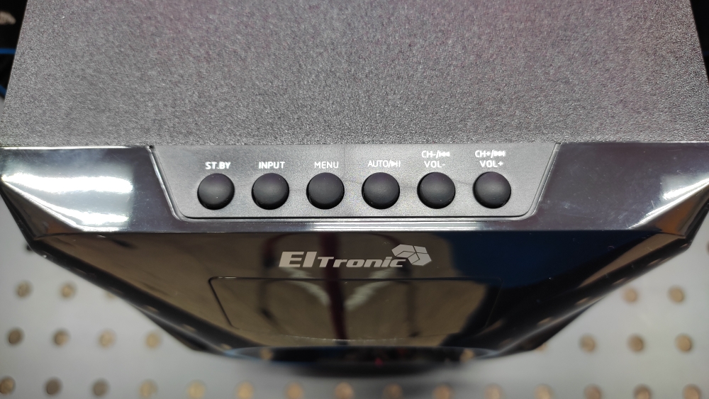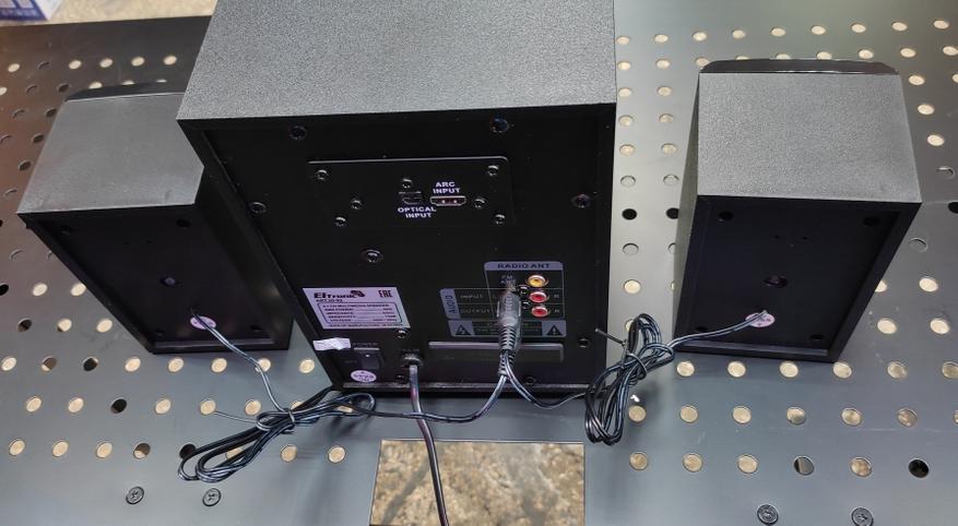 Сзади у модели ELTRONIC 20-92 расположены разъемы для подключения проводной FM-антенны, RCA-пара на AUX вход, RCA пара на вывод звука для сателлитов, а чуть выше оптический вход и HDMI для коммутации звукового сигнала с ТВ.