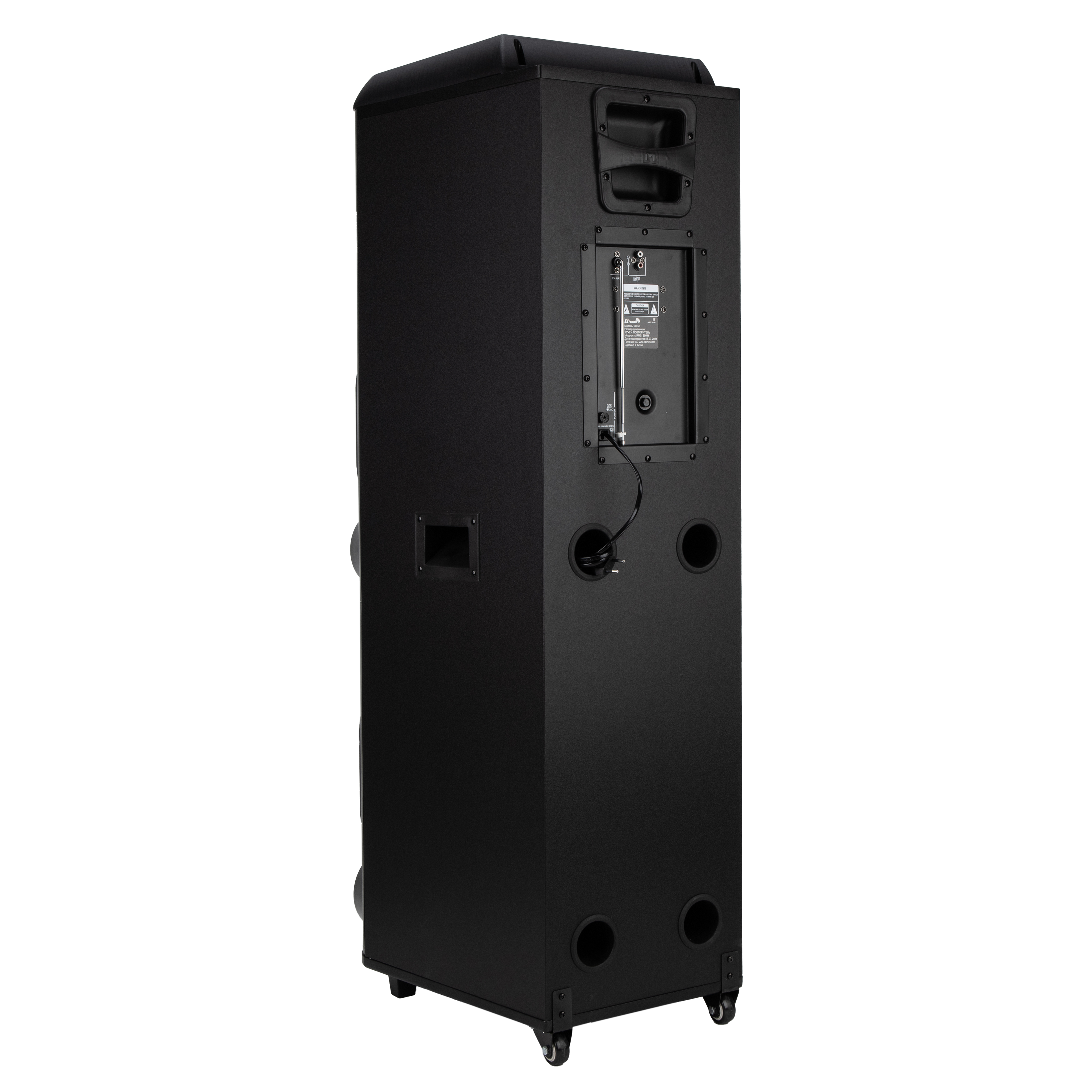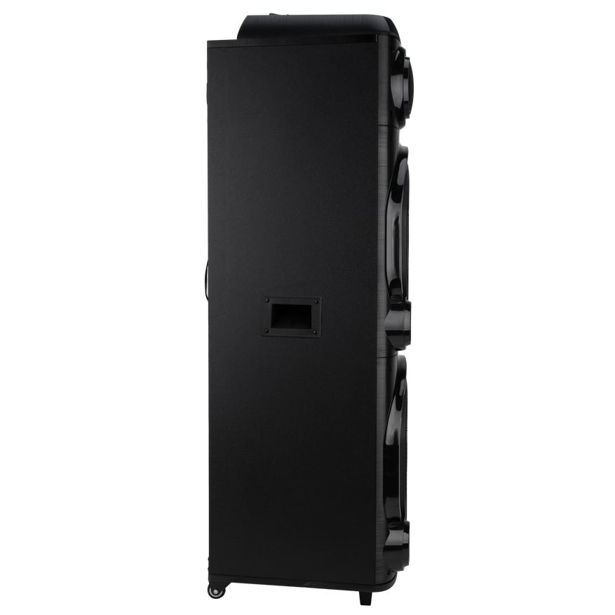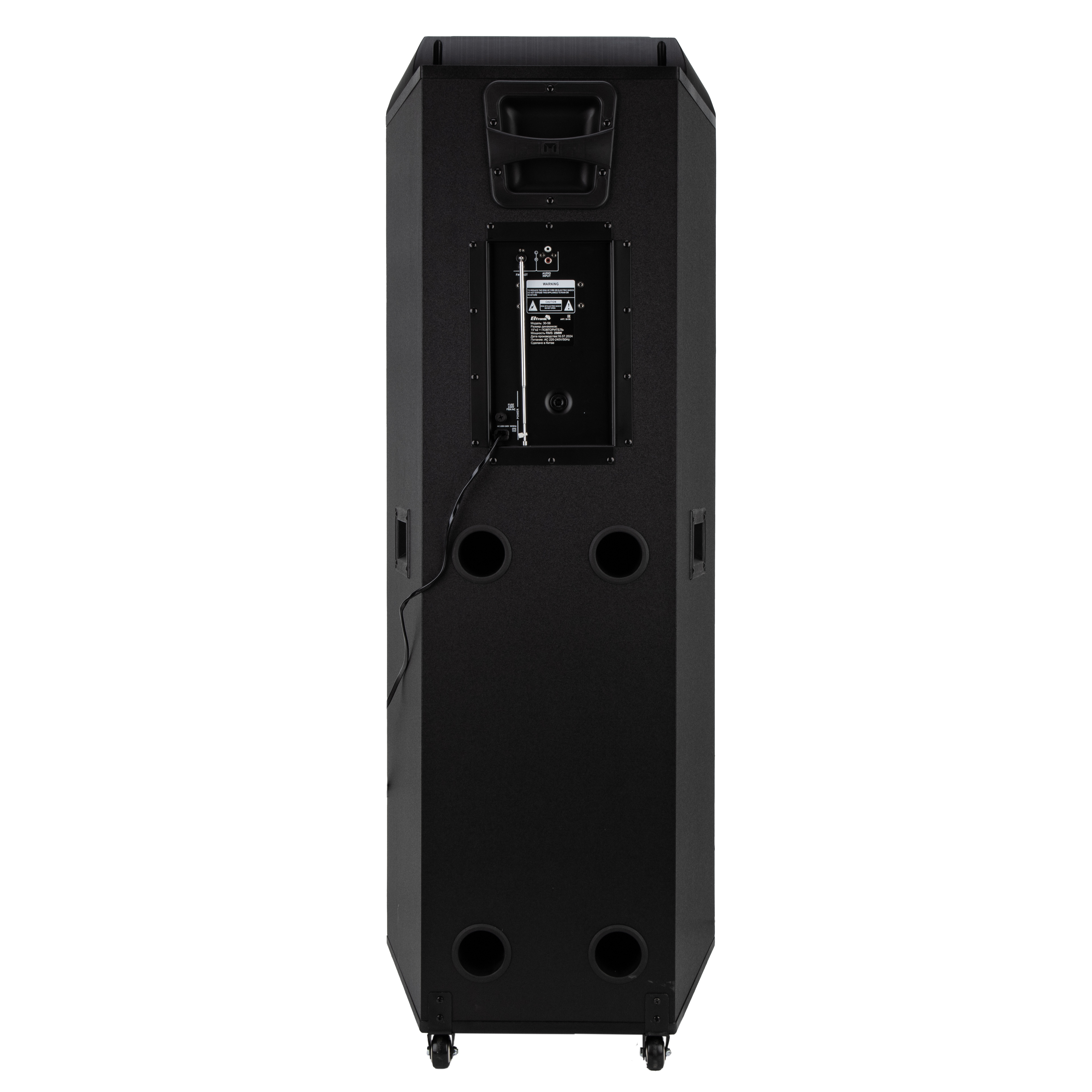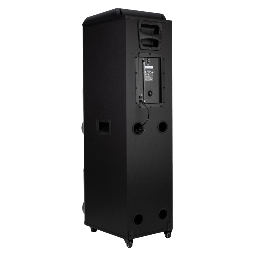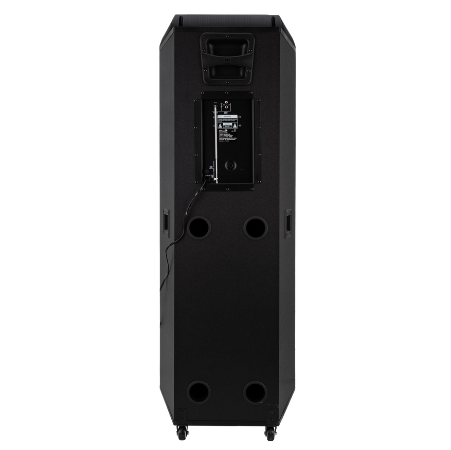 Сзади у колонки также располагается ручка для удобства перемещения на колесиках (они установлены в нижней части корпуса колонки). Здесь же установлена телескопическая FM-антенна, AUX-вход, сетевой кабель, предохранитель и 4 фазоинвертора для придания низким частотам большей глубины.