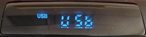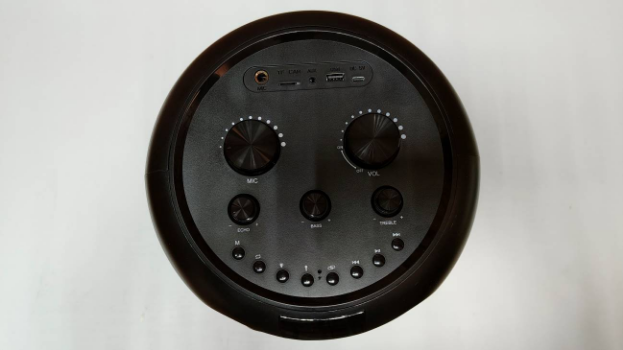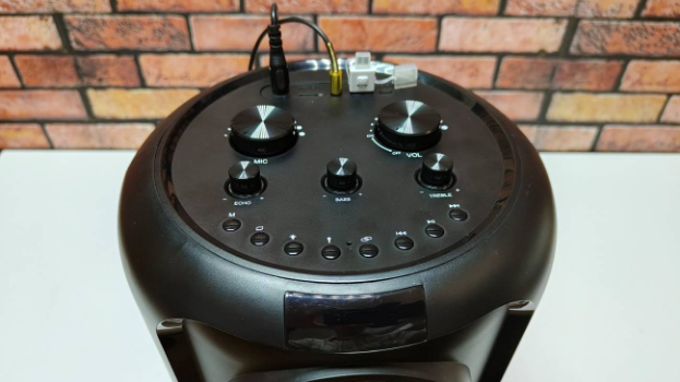 Сразу под панелью управления расположен четырехразрядный одноцветный дисплей, отображающий всю необходимую для пользователя информацию: режим воспроизведения, изменения громкости колонки, шаги регуляторов баса и эха микрофона. При перелистывании музыкальных файлов и сохраненных радиостанций высвечивается соответствующий порядковый номер.