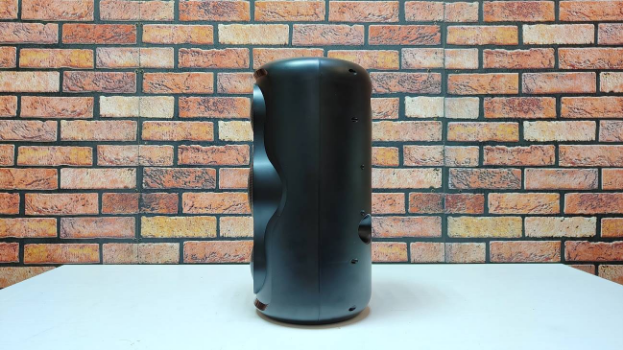 Внешний вид колонки тоже значительно выделяет модель среди конкурентов. Перед нами округлая, вытянутая вверх модель, рассчитанная на вертикальную установку. Корпус выполнен из добротного черного пластика с матовой фактурой, не собирающий пыль и отпечатки пальцев. На первый взгляд дизайн кажется простым и лаконичным, но это только до тех пор, пока вы не включили подсветку.