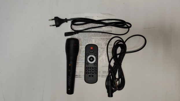 Комплектация выдалась достаточно богатой: сама акустика, проводной микрофон, пульт дистанционного управления, кабель для зарядки от сети и краткая инструкция с гарантийным талоном.