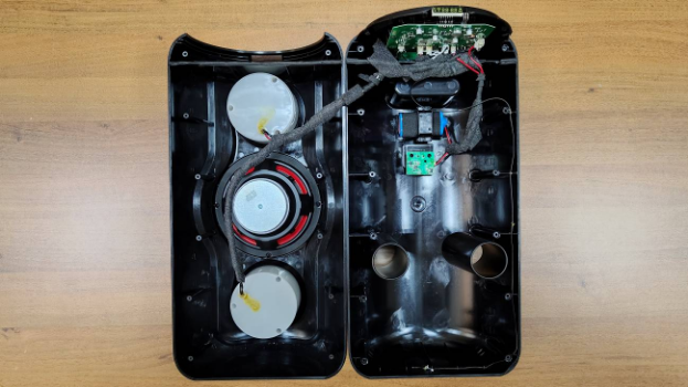 Звучание аудио системы обеспечено двумя высокочастотными динамиками по 3 дюйма каждый и одним низкочастотным на 6,5 дюймов. Сзади на корпусе имеются два фазоинверторных канала, которые успешно подавляют нежелательные шумы и улучшают звучание низкочастотного звука. Внутренне устройство с камерами под динамики создаёт чёткую и естественную звуковую сцену.