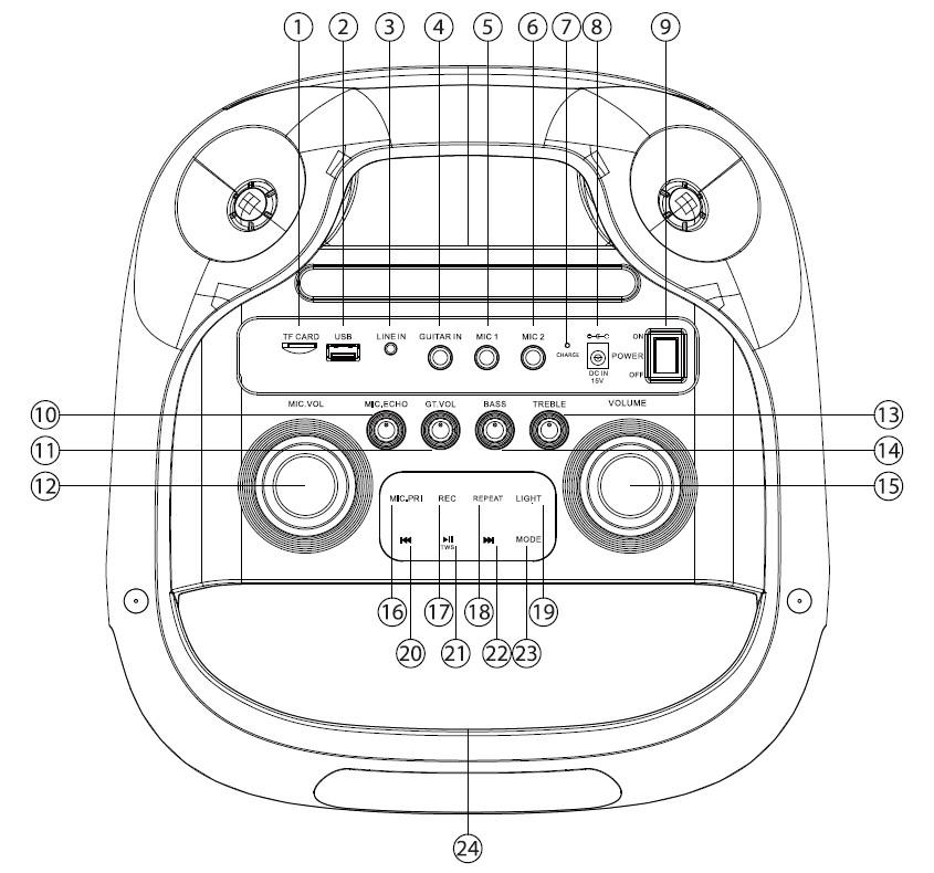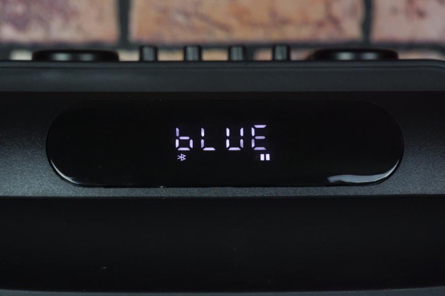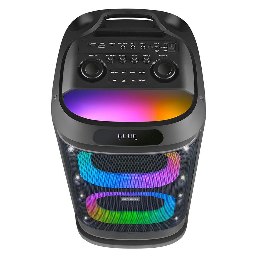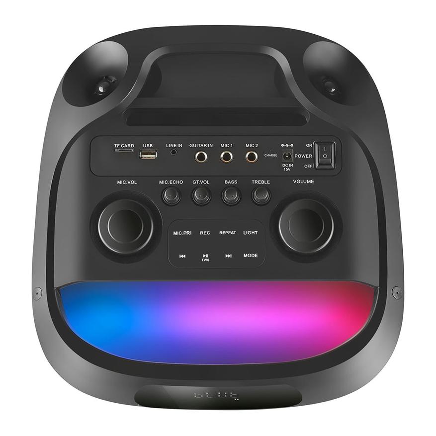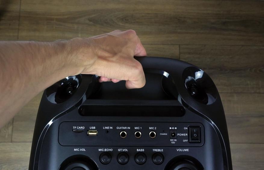 Два самых больших регулятора отвечают за настройку звука аудиосистемы и микрофона. Регуляторами поменьше можно отдельно настроить низкие и высокие частоты, эффект эха микрофона и громкость гитары. Для подключения микрофонов предусмотрены два разъема 6,3 мм, а также имеется разъем 6,3 мм для подключения гитары. Колонка поддерживает воспроизведение музыки не только по Bluetooth, но и с SD-карт, флеш-карт и через AUX.