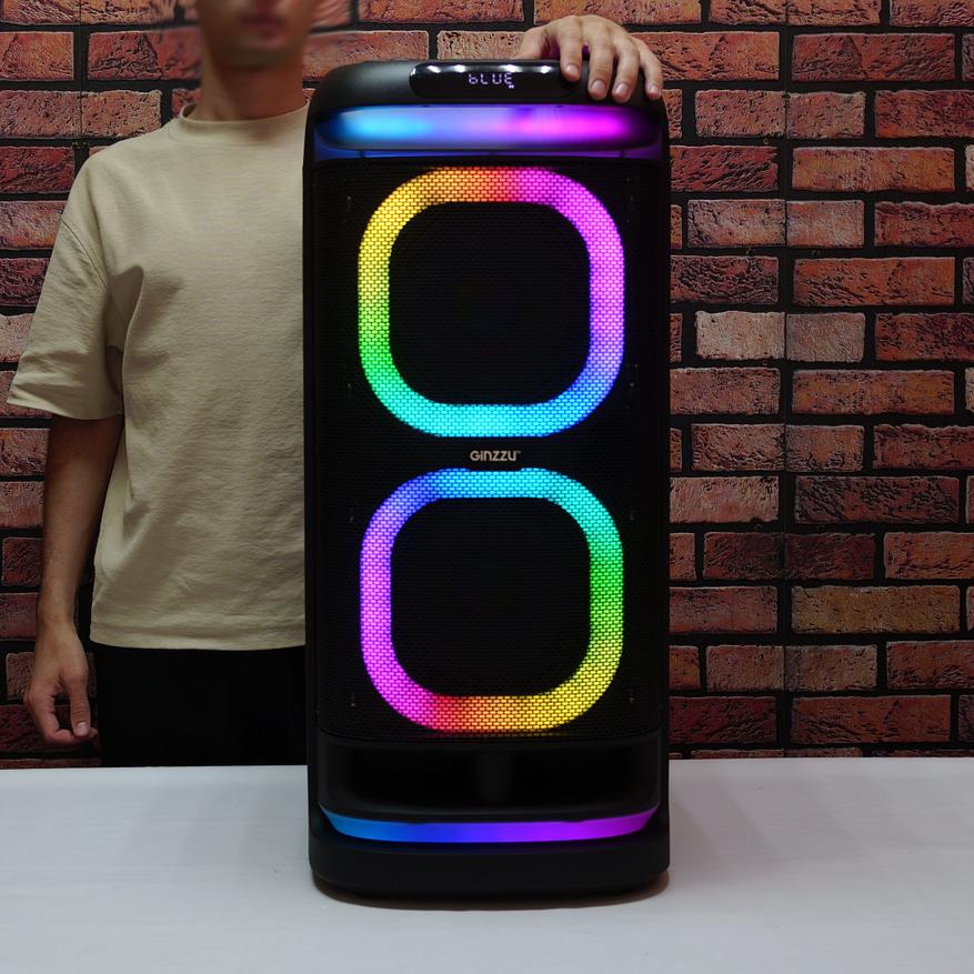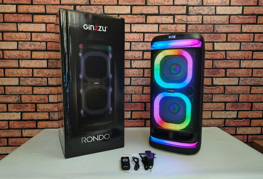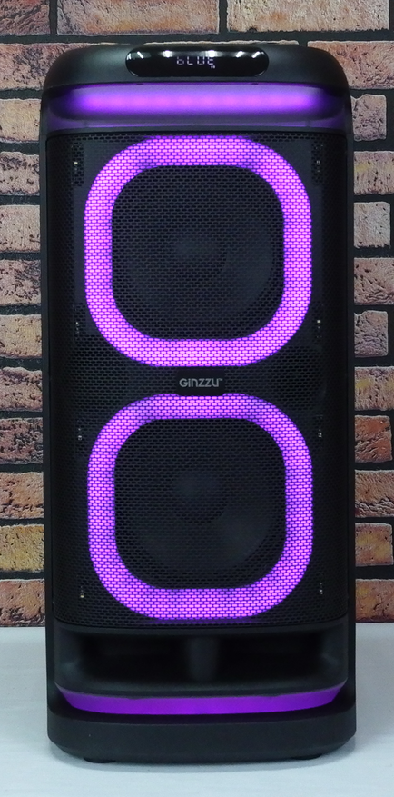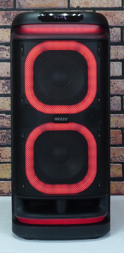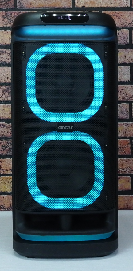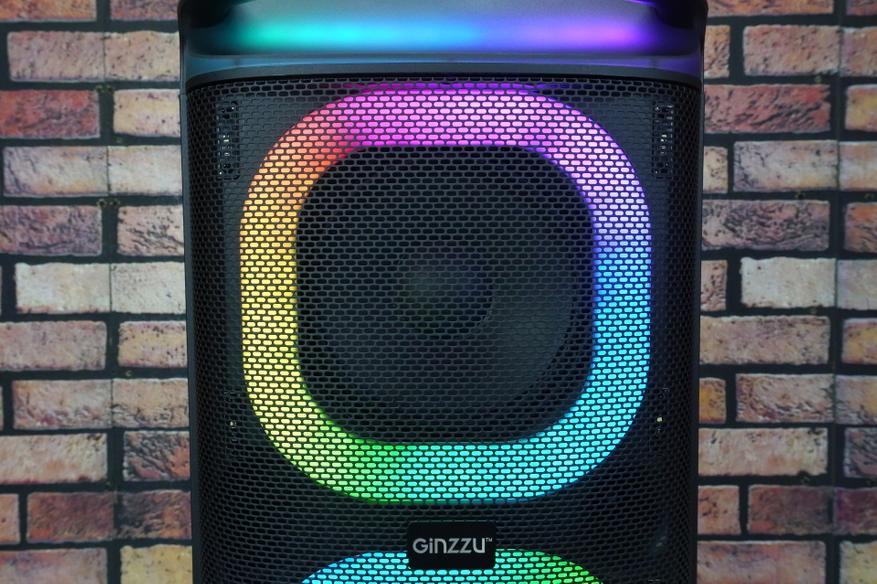 RGB подсветка активна во всех режимах работы, включая паузы между треками. LED лента обрамляет два низкочастотных динамика. Две дополнительные светодиодные ленты светят под колонку и за переднюю ручку для транспортировки.