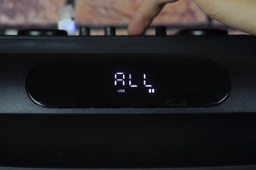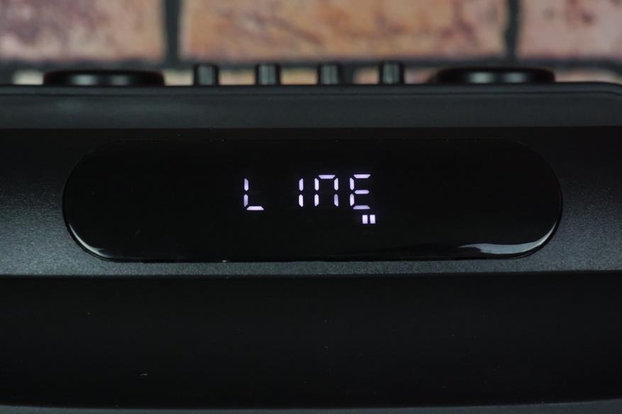 Панель управления сверху устройства включает множество регуляторов и кнопок, позволяющих настроить звук аудиосистемы, микрофона и гитары.