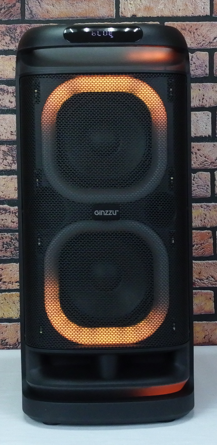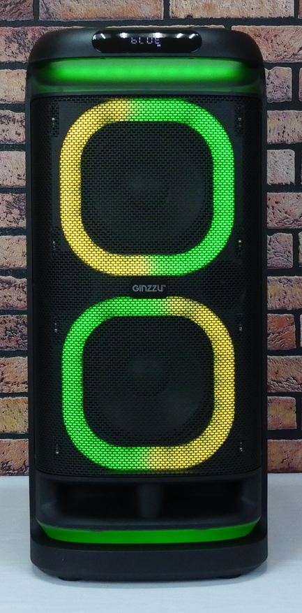 Два низкочастотных динамика диаметром 8″ и один твиттер диаметром 1″ скрыты под прочной черной перфорированной сеткой. Каждый динамик окружен отдельным элементом подсветки, которая динамически изменяется в такт музыке и предлагает множество режимов и сценариев визуализации. Для лучшего рассеивания света RGB лента закрыта белым матовым пластиком. Кроме обычной RGB подсветки, на фронтальной панели установлены 8 светодиодов, создающих стробоскопический эффект, что придает дополнительную энергию проигрываемой музыке.