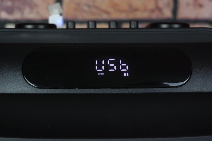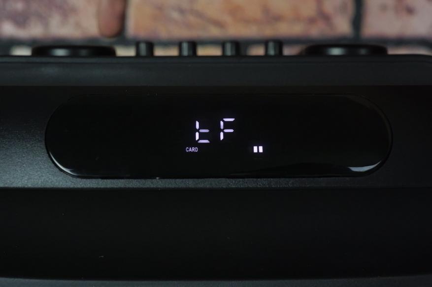 Во фронтальной ручке для перемещения установлен четырехразрядный одноцветный дисплей, отображающий всю необходимую информацию для пользователя: режим воспроизведения, изменения громкости колонки, настройки баса и эха микрофона. При перелистывании музыкальных файлов и сохраненных радиостанций на дисплее отображается соответствующий порядковый номер.