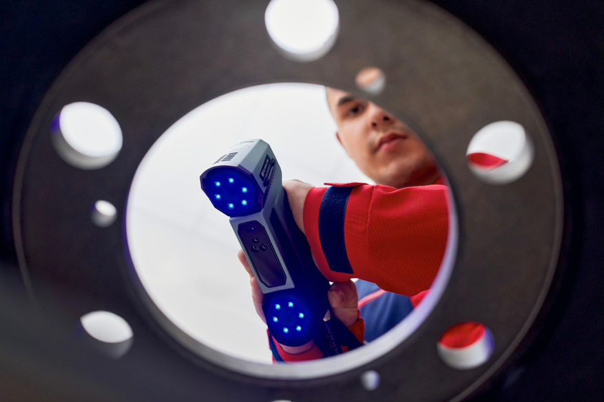 Первый этап работы с деталями в Центре исследований и разработок MARSHALL — это сверхточное 3D-сканирование на компактном метрологическом 3D-сканере ScanLine Combo. Это промышленное оборудование позволяет создать 3D-модель с точностью до 0,02 мм. Сканер задействует два различных источника света: синий лазер и инфракрасный VCSEL (поверхностноизлучающий лазер с вертикальным резонатором). В зависимости от типа исследуемой детали, могут использоваться режимы с одним или несколькими лучами, а скорость сбора данных составляет 3 600 000 точек в секунду.