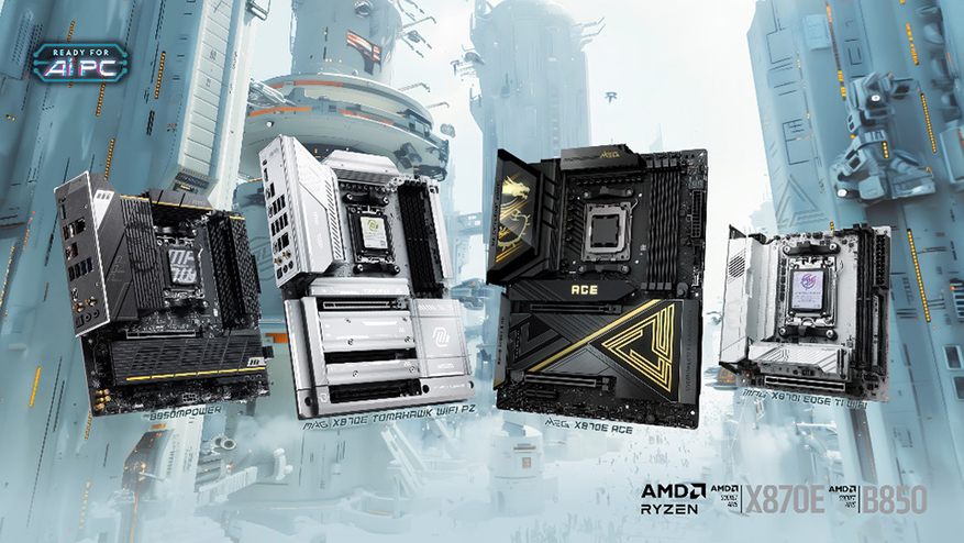 Линейка материнских плат пополнилась новыми моделями. MEG X870E ACE формата ATX выполнена в черно-золотом дизайне с эффективным охлаждением за счет волнистых радиаторов и тепловой трубки. Плата поддерживает PCIe 5.0, Wi-Fi 7, 10G Ethernet и USB 40 Гбит/с. Компактные платы MPG X870I EDGE TI WIFI и MPG B850I EDGE TI WIFI для Mini-ITX сборок имеют серебристо-белый дизайн, поддержку PCIe 5.0 и Wi-Fi 7. Модель MAG X870E TOMAHAWK WIFI PZ со скрытыми разъемами упрощает сборку, а B850MPOWER для формата M-ATX ориентирована на оверклокеров благодаря двум слотам DIMM и модулю EZ Dashboard для удобной настройки.