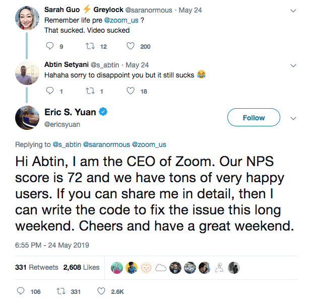 CEO компании, Эрик Юань создал Zoom, уволившись с поста вице-президента отдела Cisco Webex, где его требования оптимизировать этот продукт упорно отвергались руководством. Собрав свою команду инженеров, Юань засел над разработкой собственной программы для видеоконференций. Так после двух лет упорной работы в 2011 году, сервис Zoom запустился. И сразу же выделился на фоне занимавших на тот момент нишу гигантов — Skype, Hangouts и Cisco Webex.