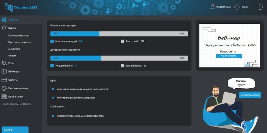 eTutorium LMS обладает простым интуитивным интерфейсом, включает в себя встроенную вебинарную платформу, редактор курсов и тестов, диалоговый тренажер.