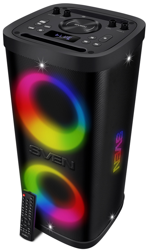 Управление устройством осуществляется двумя способами: можно подойти к аудиосистеме для вечеринок и воспользоваться кнопками и поворотными регуляторами на верхней панели, а можно этого и не делать — все ключевые функции продублированы на идущем в комплекте пульте дистанционного управления. Вся информация о работе Sven PS-930 отображается на ярком и контрастном LED-дисплее. Ну, а самая заметная часть новинки — это, конечно, динамическая RGB-подсветка. Как и всегда, предусмотрено несколько вариантов свечения, подходящих под разные сценарии использования — от тихого вечера с любимыми до шумного праздника. Добавляет эффектности свечению яркий стробоскоп, превращающий любое место в настоящий танцпол.