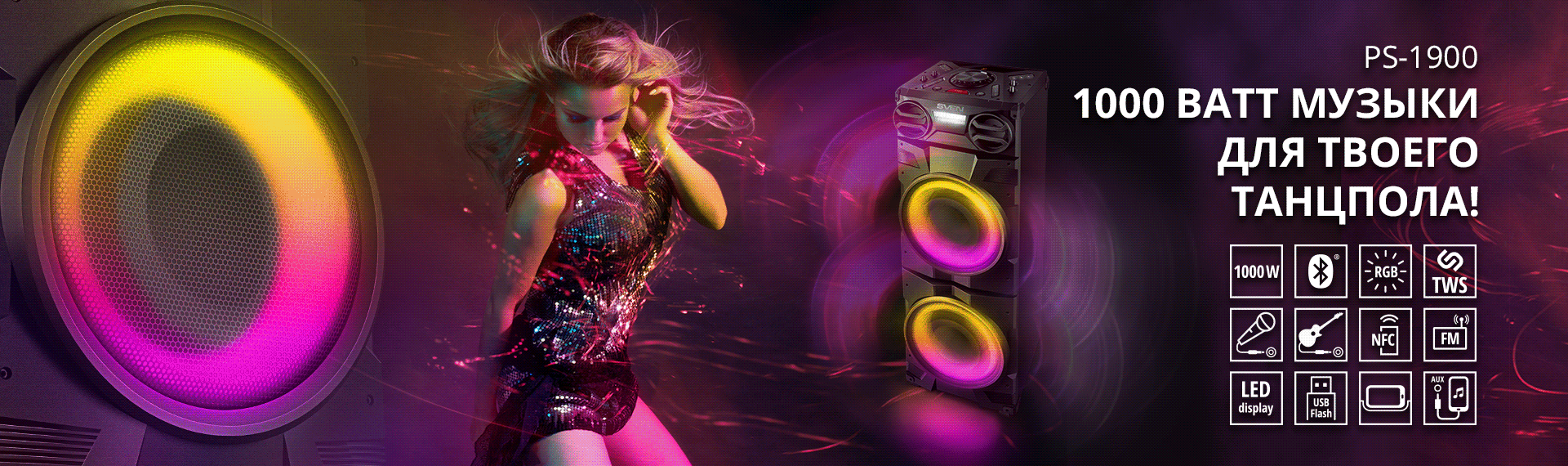 Широкий выбор вариантов источника сигнала обеспечивает универсальность использования: проводное подключение по aux, беспроводное по Bluetooth, в том числе с помощью NFC-метки, воспроизведение файлов с накопителей USB-flash, либо FM-радио. Использование дополнительного подключения второй колонки SVEN PS-1900 при помощи функции TWS обеспечит стереозвучание и поможет прокачать практически любое помещение, за исключением разве большого концертного зала. Встроенный эквалайзер поможет подобрать необходимый звуковой баланс частот.