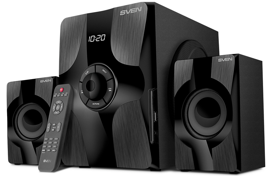 Управлять системой можно не только через переднюю панель, но и с помощью дистанционного пульта — вставать с любимого дивана или кресла не придется. Подключение к источнику звука возможно двумя способами: к ПК будет удобнее подключиться кабелем через разъем AUX, а для мобильных гаджетов использовать Bluetooth — такая опция тоже предусмотрена. Подборку самых любимых треков можно записать на USB-накопитель и воспроизводить с помощью встроенного в SVEN MS-315 плеера, а если захотелось новостей и свежих релизов от любимых исполнителей — самое время воспользоваться FM-приемником.