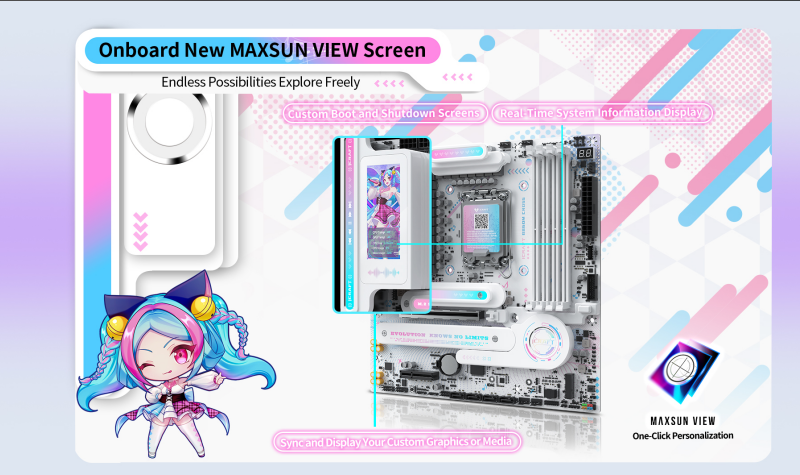 Главной особенностью модели iCraft B860M Cross Pro стал встроенный 3,4-дюймовый дисплей Maxsun View. Этот экран позволяет в реальном времени отслеживать состояние системы, отображать кастомные анимации загрузки и выключения, а также использовать функцию зеркального отображения рабочего стола. В стандартной версии Crossпредусмотрен мини-дисплей с фирменной анимацией.