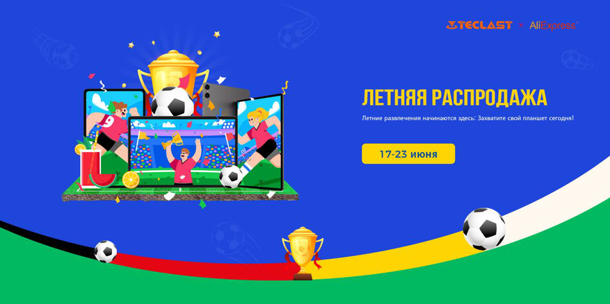 AliExpress запустил вторую летнюю распродажу июня (17.06-23.06), предлагая существенные скидки на все модели планшетов Teclast как раз к чемпионату Европы по футболу 2024 года. Особое место занимают модели T65 Max и T60, сочетающие расширенные функции с привлекательной ценой.