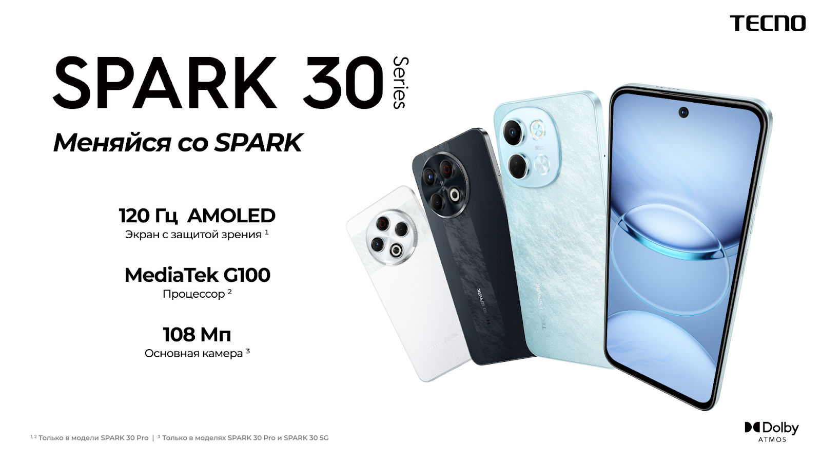 Флагманская модель серии, Spark 30 Pro, выделяется своим AMOLED-экраном с частотой обновления 120 Гц и защитой для зрения, подтвержденной сертификатом TUV Rheinland. Устройство оснащено чипом MediaTek Helio G100, основной камерой на 108 Мп с 3-кратным оптическим зумом, и аккумулятором емкостью 5000 мАч с поддержкой быстрой зарядки мощностью 33 Вт.