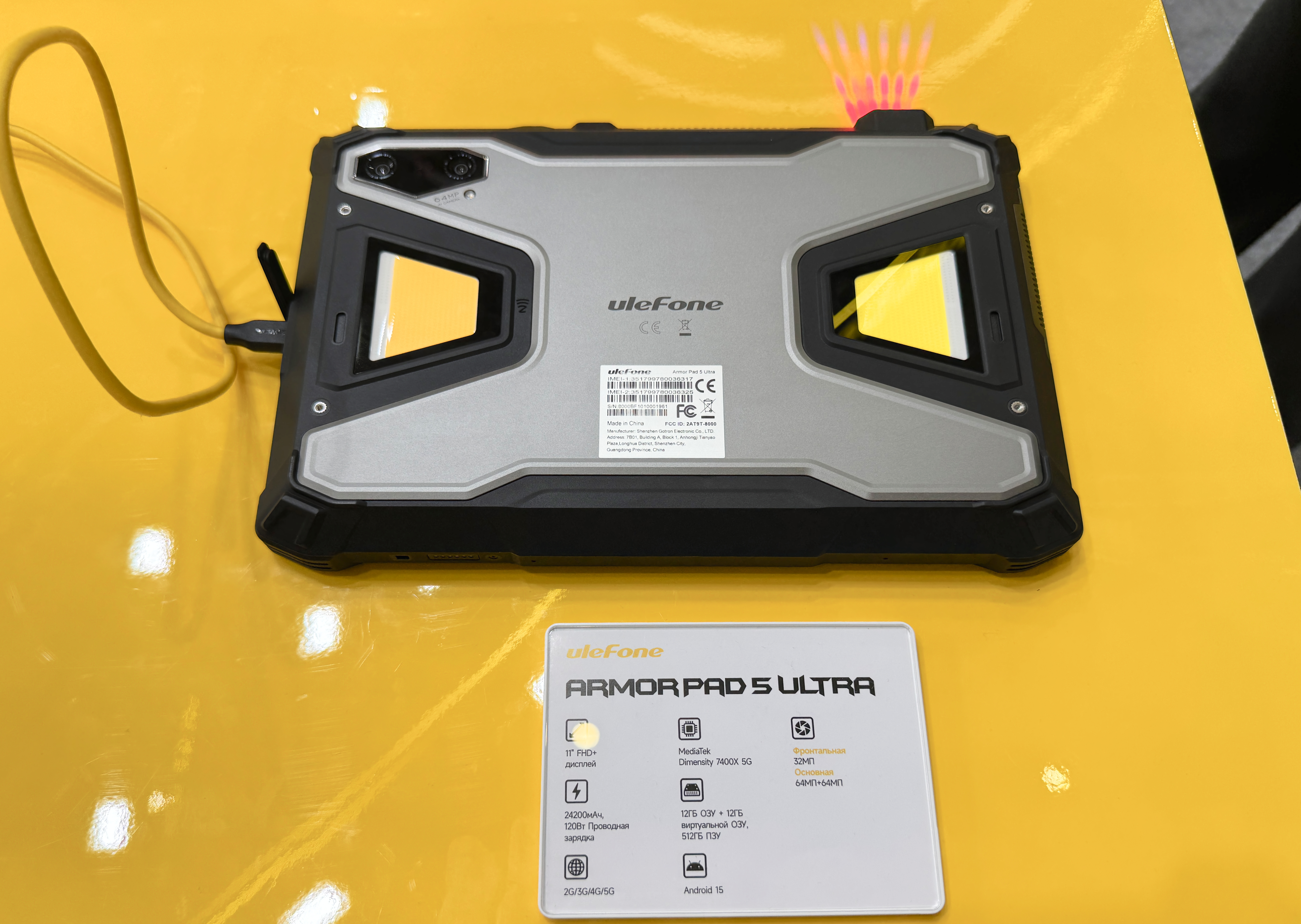 Планшет Armor Pad 5 Ultra со встроенным проектором создан для промышленного применения и активного отдыха. Прочный корпус с прорезиненными краями и усиленными портами выдерживает удары, вибрацию и погружение в воду. 10,4″ IPS‑экран с разрешением 2400 x 1080 и поддержкой стилуса подходит для чертежей, заметок и навигации — сенсор реагирует даже в мокрых перчатках.