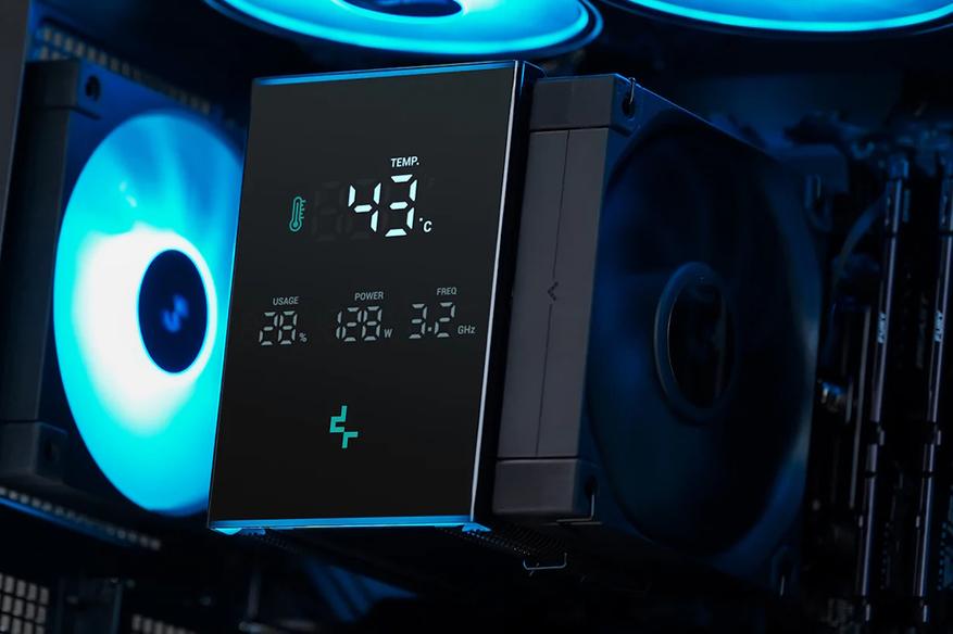 Существенно изменили панель с дисплеем в AK500 DIGITAL PRO и AK500 DIGITAL PRO WH. В обычной модели серии Digital на верхнюю грань выводится только одно значение: температура, загрузка ЦП и так далее. Теперь же экран способен одновременно демонстрировать сразу четыре параметра: температуру процессора, процент загрузки, текущую мощность CPU в Ваттах и тактовую частоту. Для управления дисплеем используется программное обеспечение DeepCool и необходим лишь свободный внутренний разъем USB 2.0 на материнской плате.