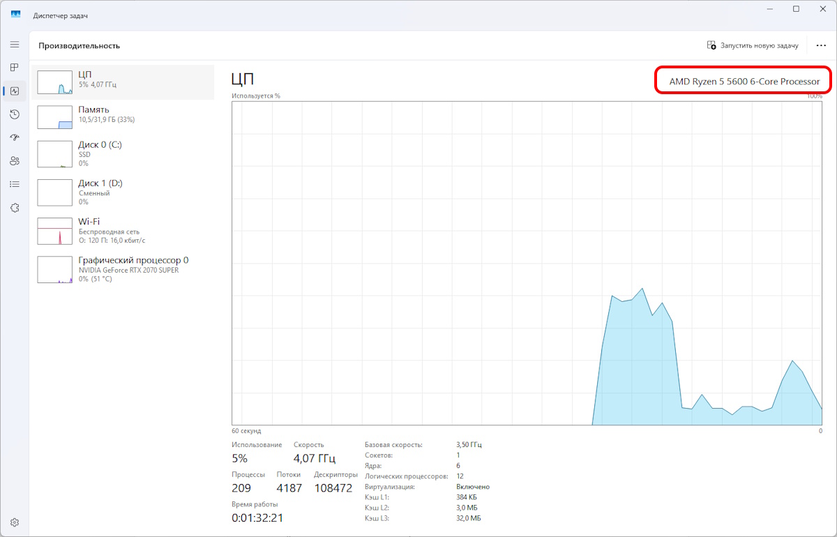 Диспетчер задач — встроенная утилита Windows, при помощи которой можно определить модель процессора, а также контролировать и управлять процессами системы.
