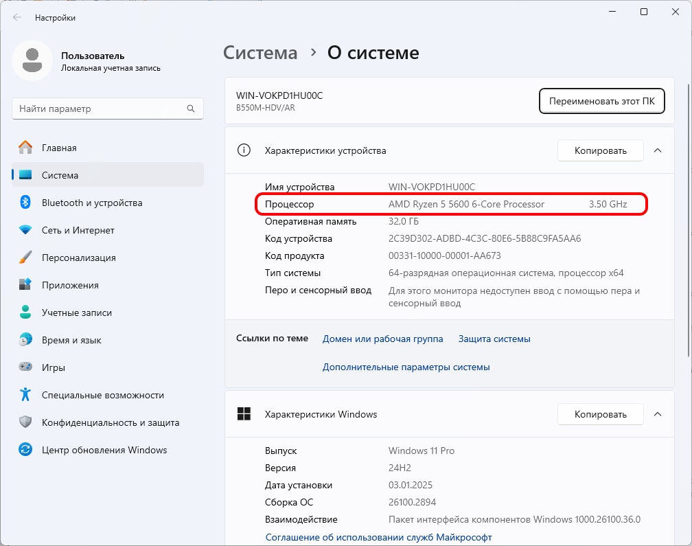 Информация о процессоре будет отображена в блоке «Характеристики устройства». Здесь же вы сможете посмотреть тип операционной системы и объем оперативной памяти.
