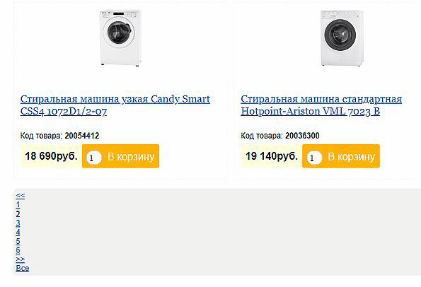 Здесь довольно много смартфонов, есть кое-что из компьютерной техники, но основа ассортимента — техника бытовая. Её много. Но поиск неудобный. На иллюстрации ниже — то, как организовано ориентирование в большом списке и переходы между страницами.