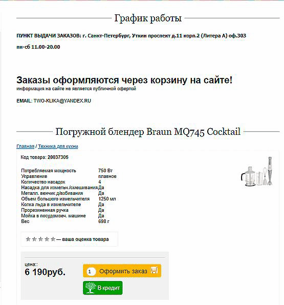 Интернет-магазин «2 клика» привлёк нас исключительно предложениями низких цен при поиске бытовой техники в Яндекс.маркете. В продаже обнаружилась не только бытовая техника, но и некторое количество смартфонов, гаджетов, компьютерной техники, а также пустых рахделов каталога.