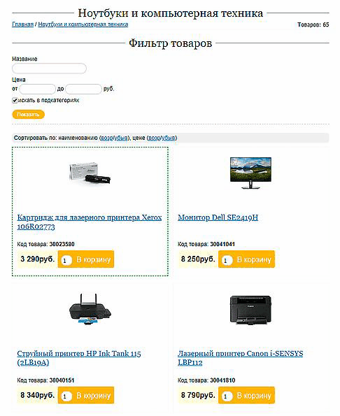 Списки товаров удивляют даже не минималистичностью фильтров, а полным их отсутствием — возможна только самая простая сортировка. При этом, например, в разделе ноутбуков и компьютерной техники прямо сверху мы видим мешанину из одного картриджа, монитора и двух принтеров: конечно, искать в таком каталоге по-нормальному не получится.