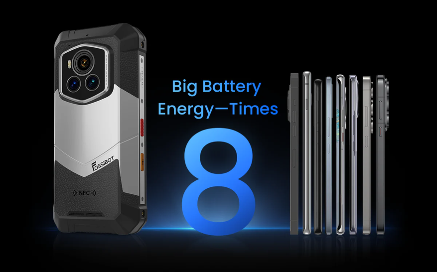 Теперь перейдём к остальным параметрам. FOSSiBOT F107 Pro работает на базе чипсета Mediatek Dimensity 7300 и в зависимости от версии оснащается 12/512 и 16/512 ГБ памяти. IPS-экран модели имеет крупную диагональ 6,95 дюйма, разрешение 2460x1080 пикселей и частоту 120 Гц. Батарея получила гигантскую ёмкость 28000 мАч и поддержку 66-ваттной зарядки по проводу. Из коммуникаций заявлены Wi-Fi 6, NFC и Bluetooth 5.4. Корпус устройства защищён по трём стандартам (IP68, IP69K, MIL-STD-810H), а экран прикрыт стеклом Gorilla Glass 3.