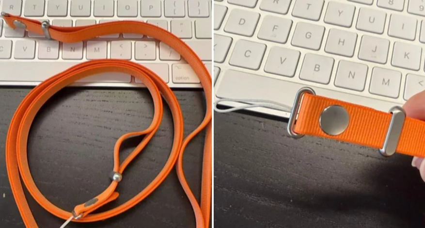 Плечевой ремень выполнен в ярко-оранжевом цвете, который соответствует новой цветовой схеме iPhone 17 Pro. Аксессуар оснащен металлическими элементами — кольцом для регулировки длины и фиксирующей пряжкой. Внутри ремня размещен гибкий металлический каркас, обеспечивающий прочность конструкции.