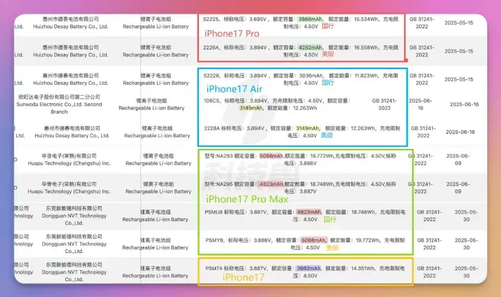 За день до официальной презентации Apple, которая состоится 9 сентября, в сеть попали точные данные о ёмкости аккумуляторов всей линейки iPhone 17. Информация была обнаружена в китайских нормативных документах и распространена через ресурс ShrimpApplePro.