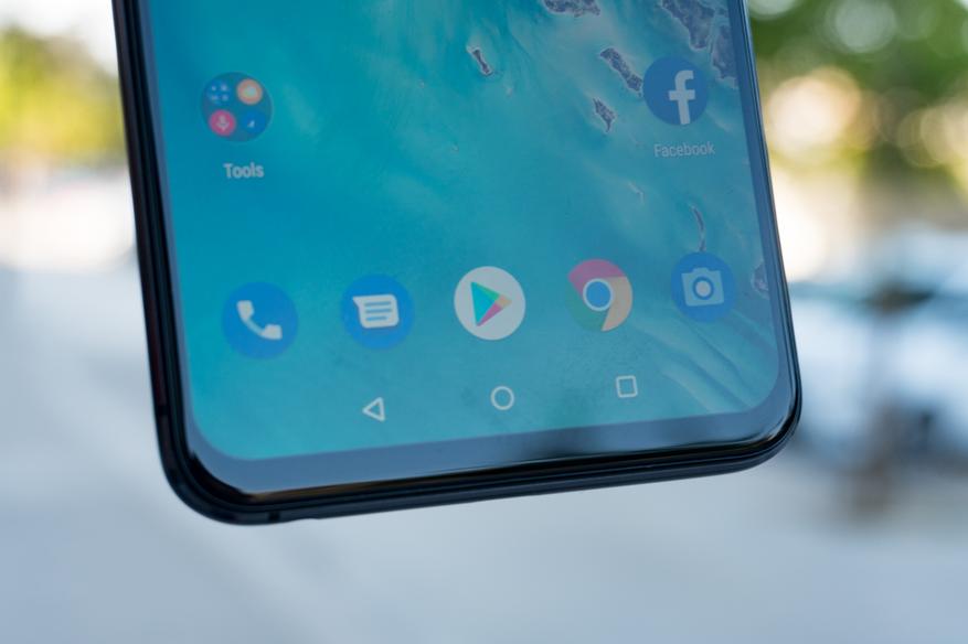 Ни «брови», ни выреза, ни дырки отверстия — только чистый экран от края до края. Диагональ — 6,4 дюйма, края закруглены. Снизу, к сожалению, есть «подбородок». Мешать не мешает, но это даёт –10 к футуристичности. Матрица IPS, разрешение FHD+ (2340 x 1080 пикселей), чудаковатое соотношение сторон 19,5:9. Заявлена максимальная яркость 600 нит — это много (если сравнивать с другими аппаратами), но в солнечный майский день в Валенсии, где представили смартфон, с экрана читать было сложновато.