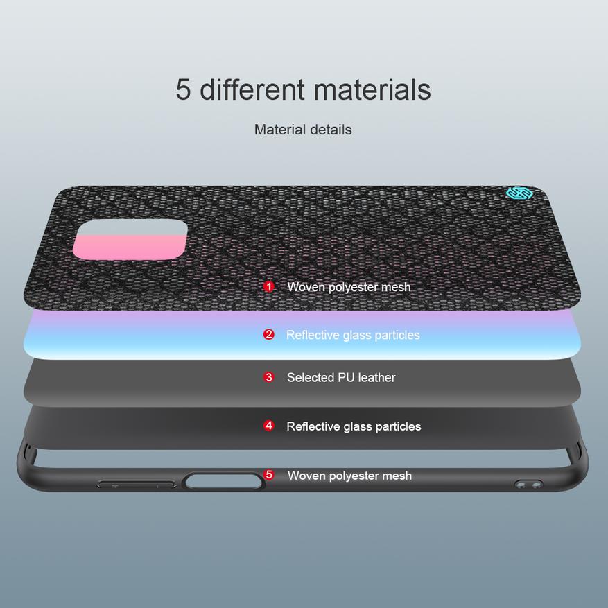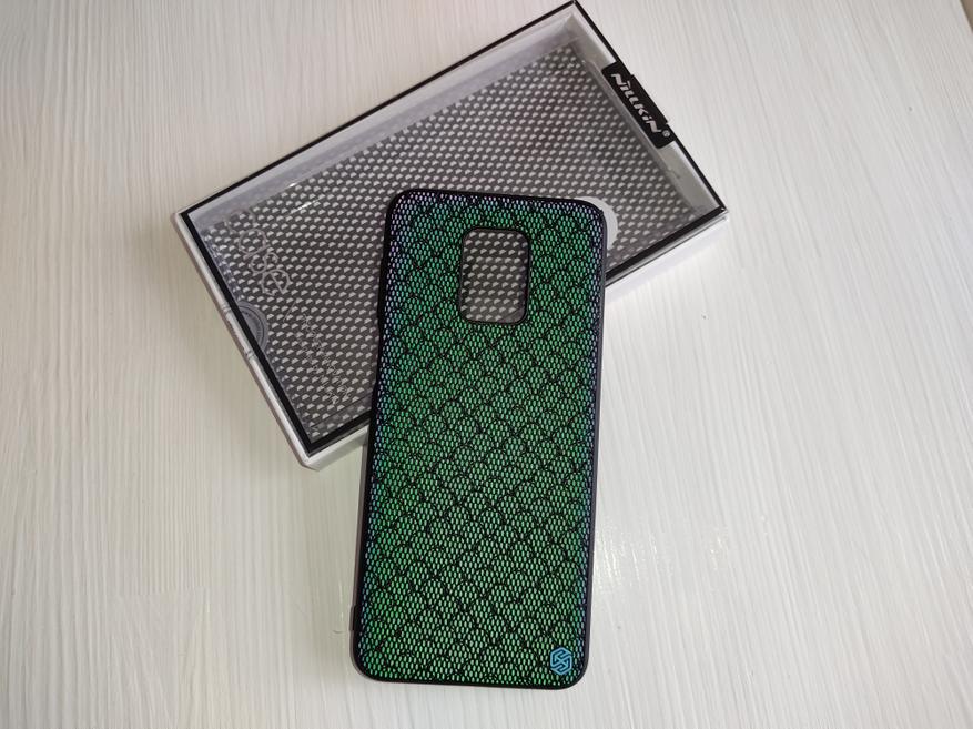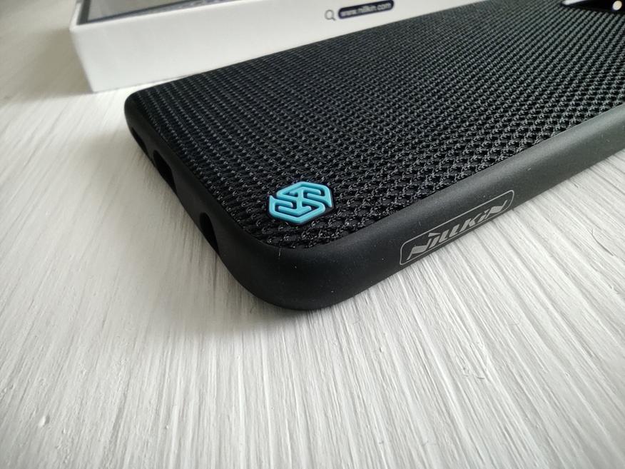 Самая главная часть бампера — это сторона с узором - выглядит эффектно. Сетчатое покрытие приятное на ощупь, выглядит опрятно, пыль из карманов не собирает в отличии от экрана и блока камер. В углу разместилась аккуратная нашлепка с логотипом Nillkin выполненная из резины.